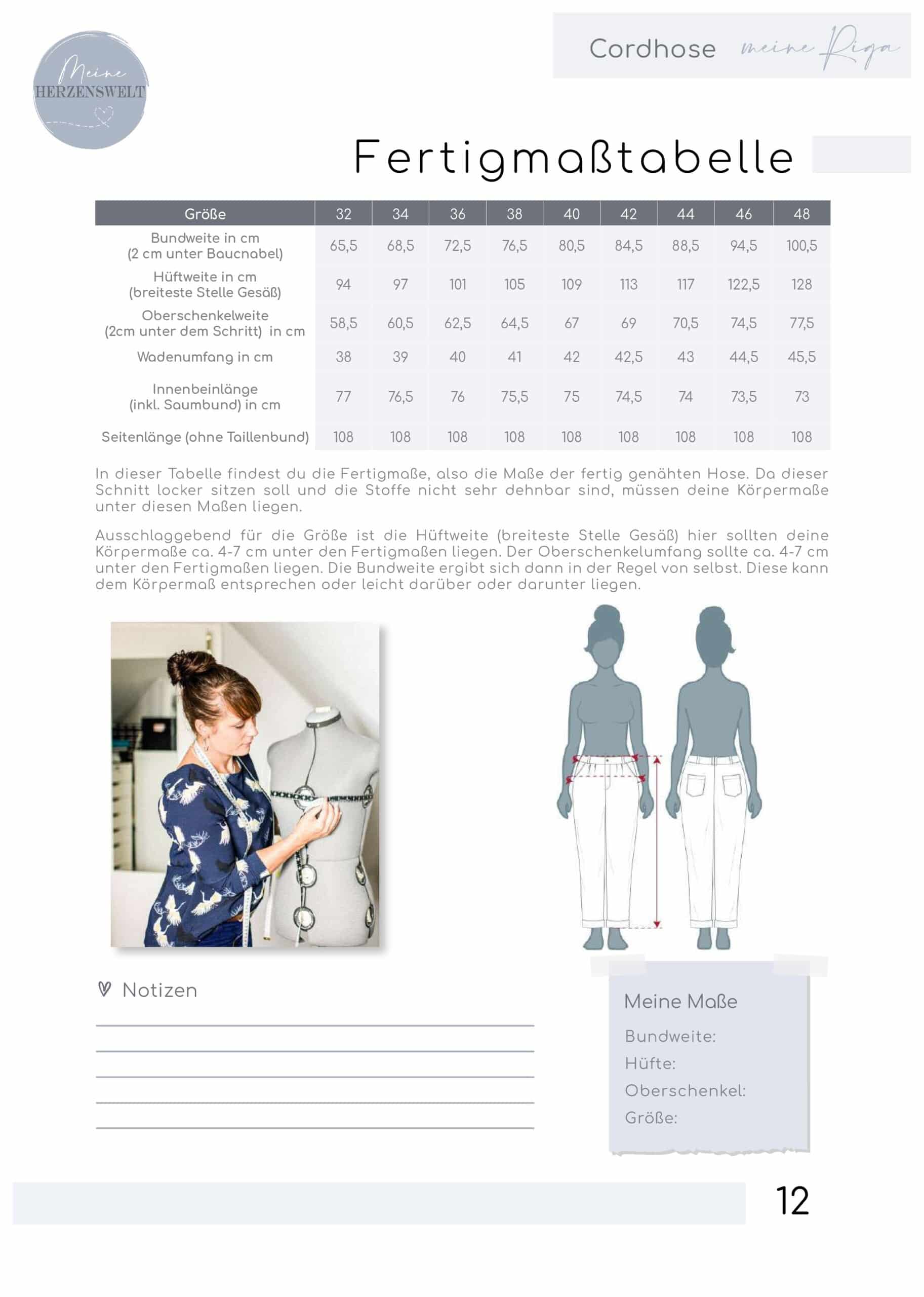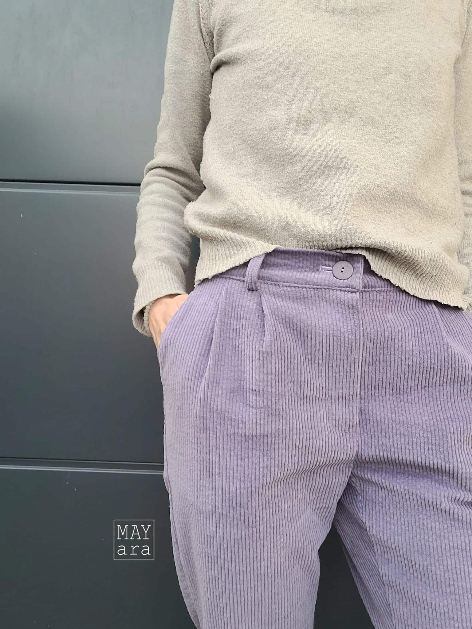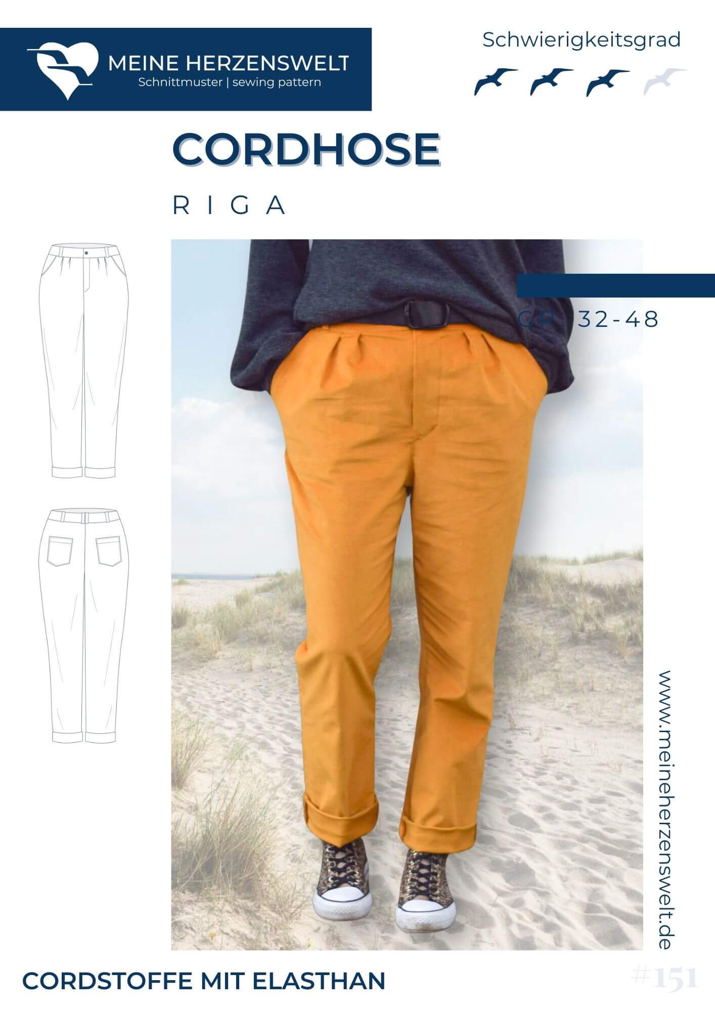 Das Schnittmuster ist auf Cordstoffe ausgelegt, vorzugsweise mit einem kleinen Elasthananteil, was der Hose nicht nur eine bequeme Passform, sondern auch eine elegante Struktur verleiht. Cordjersey und andere sehr weiche, dehnbare Stoffe eignen sich nicht für Riga. Riga kann auch aus anderen Hosenstoffen mit einem Elasthananteil von 2-5 % genäht werden, allerdings sollten die Stoffe nicht zu fest oder steif sein, da die Hose sonst ungünstig fallen kann.