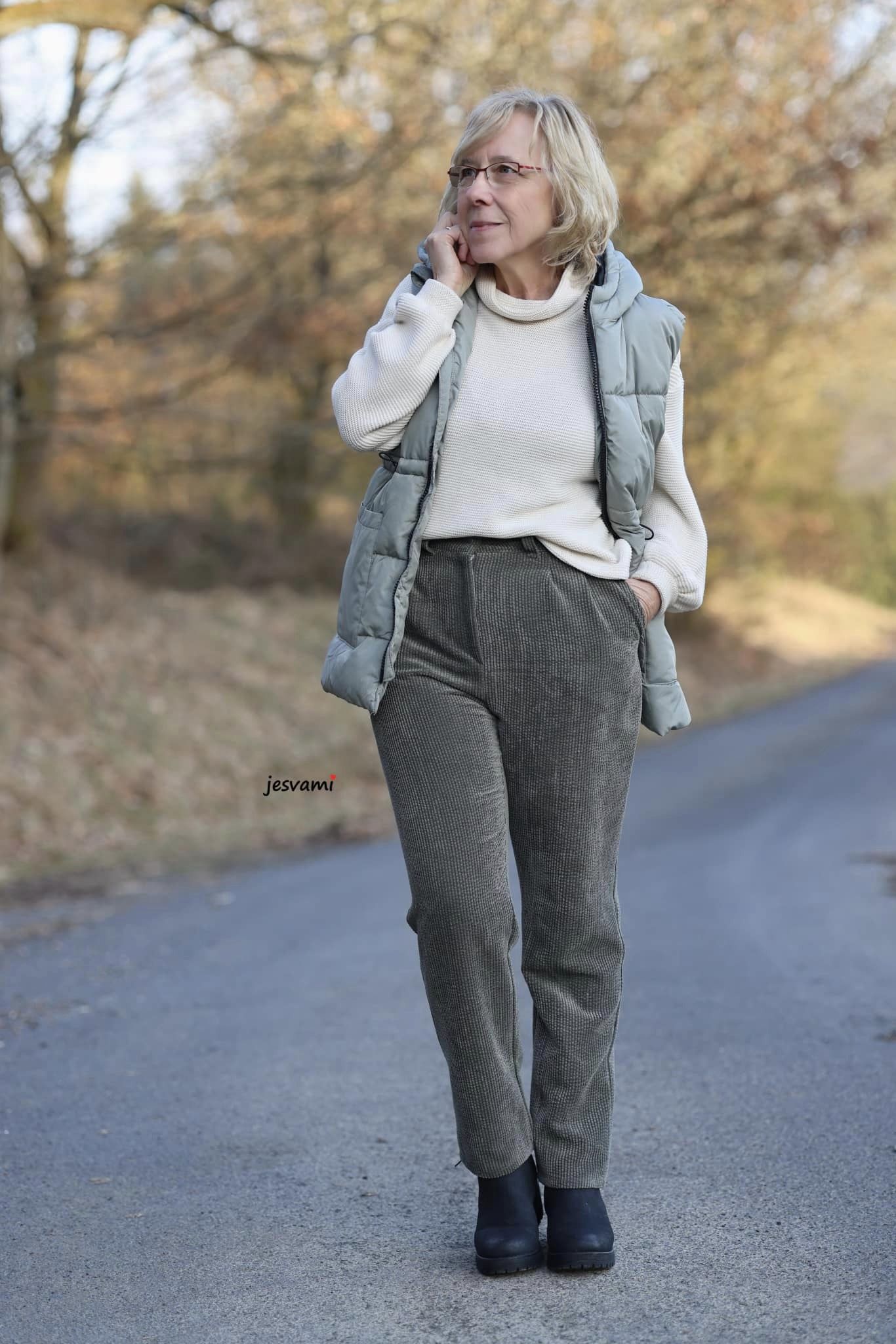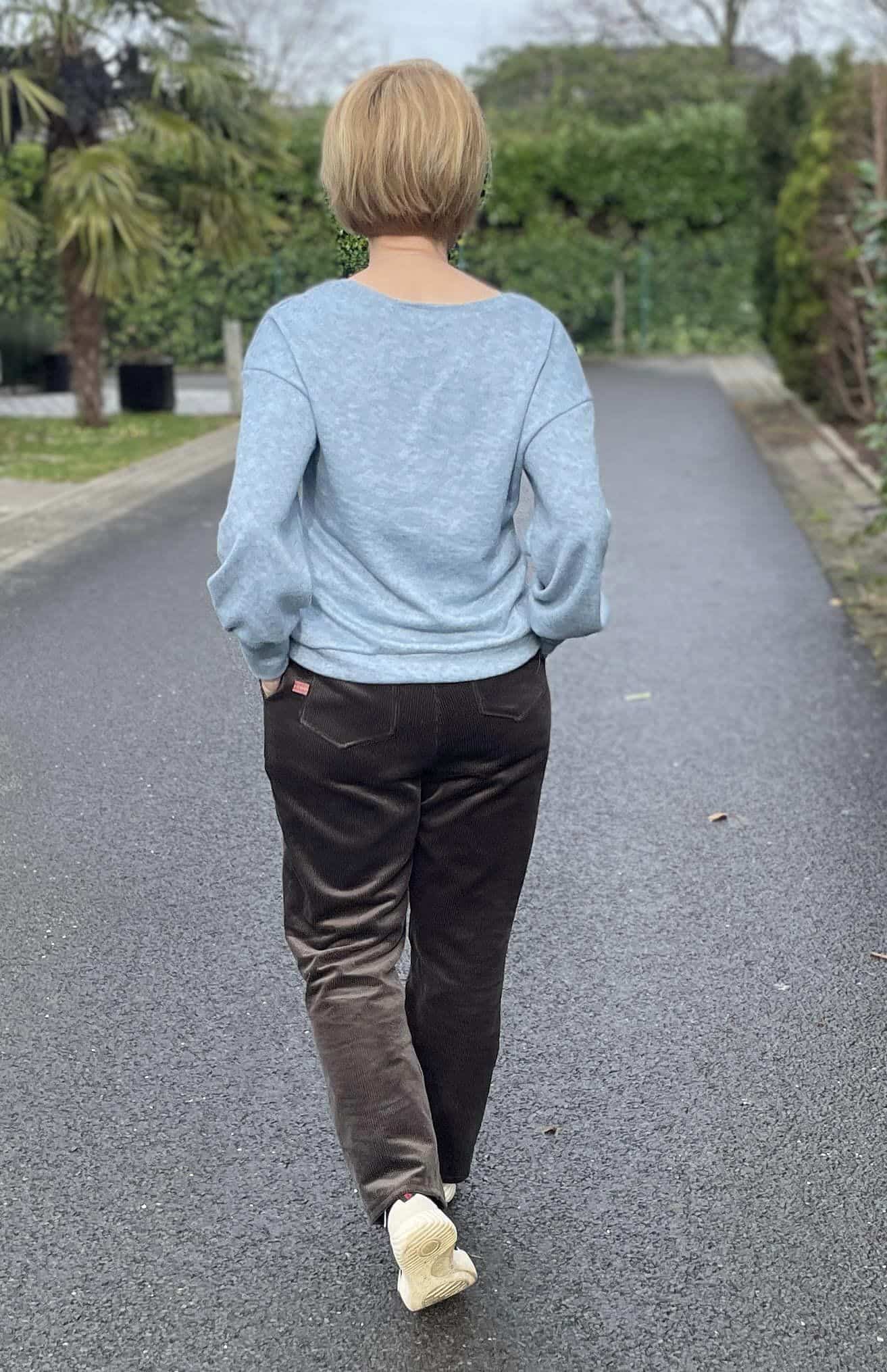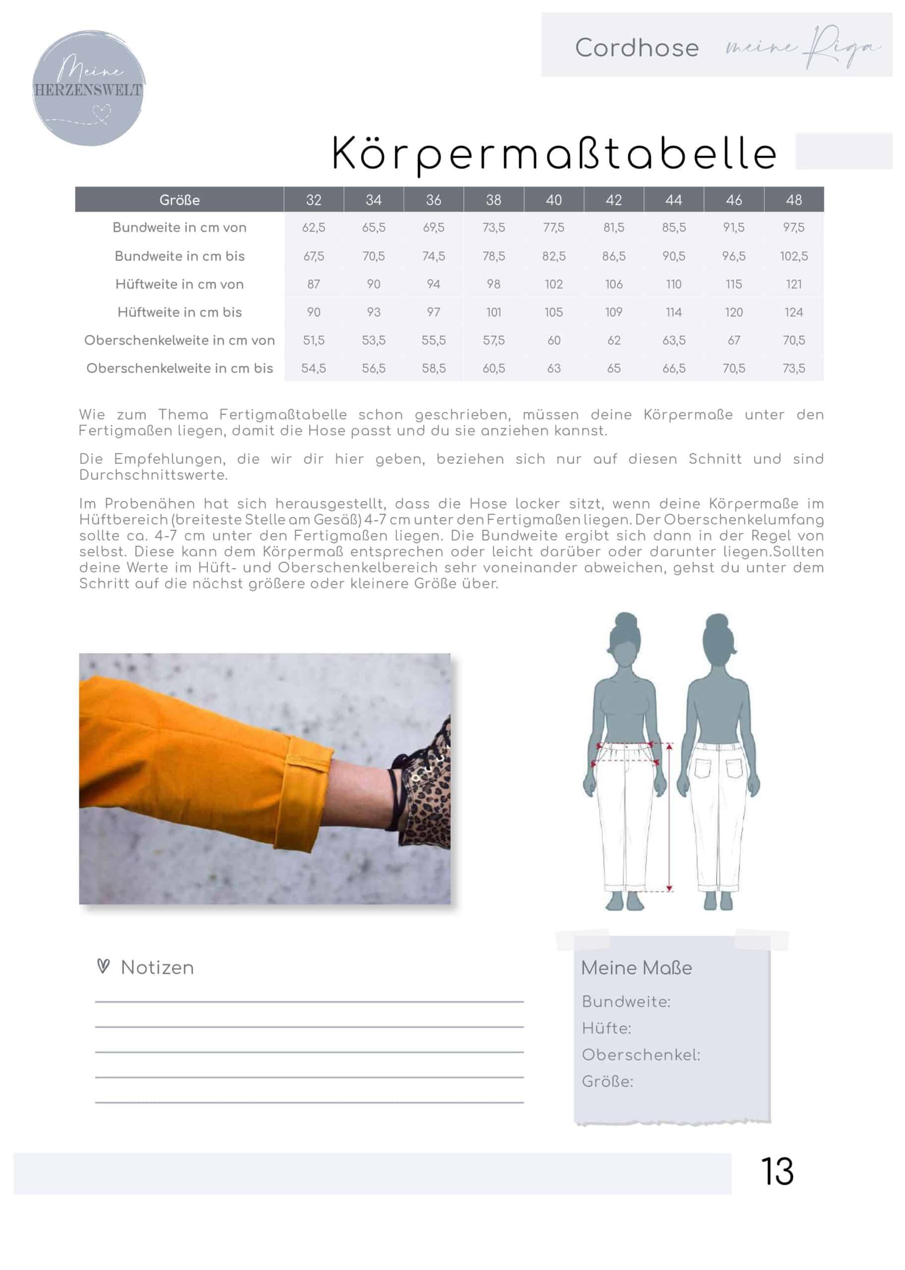 Das Schnittmuster ist auf Cordstoffe ausgelegt, vorzugsweise mit einem kleinen Elasthananteil, was der Hose nicht nur eine bequeme Passform, sondern auch eine elegante Struktur verleiht. Cordjersey und andere sehr weiche, dehnbare Stoffe eignen sich nicht für Riga. Riga kann auch aus anderen Hosenstoffen mit einem Elasthananteil von 2-5 % genäht werden, allerdings sollten die Stoffe nicht zu fest oder steif sein, da die Hose sonst ungünstig fallen kann.