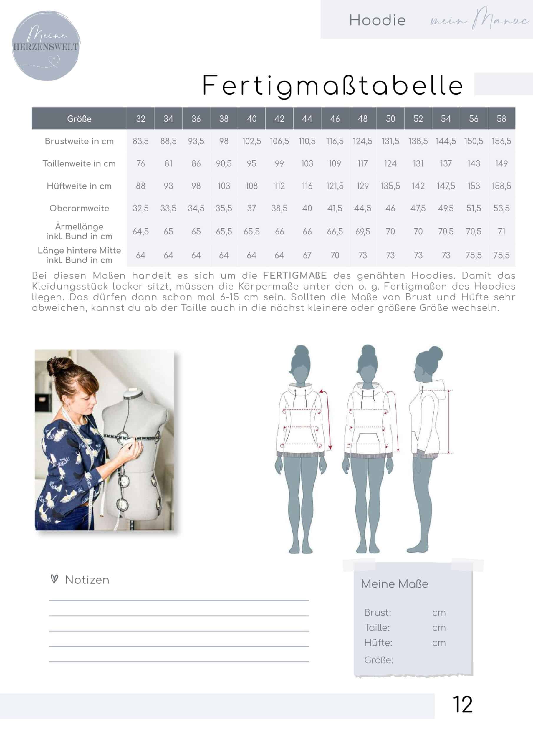 Mit unserem Schnittmuster Manuc bekommst du einen Schnitt für einen Hoodie bzw. einen Pullover mit Kapuze, Kragen oder Halsbündchen.