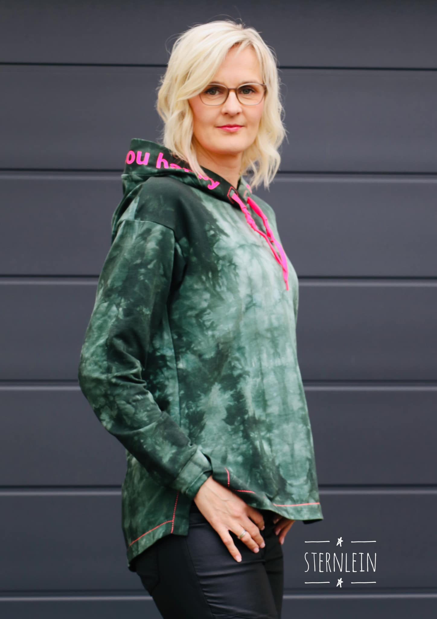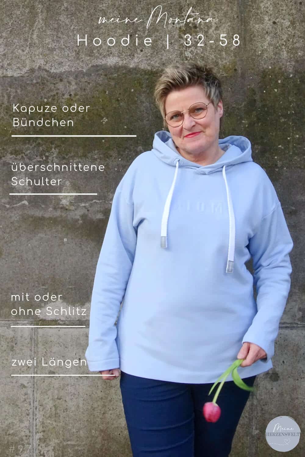 Mit unserem Schnittmuster „Montana“ für einen Hoodie / Sweater für Damen hast du die perfekte Möglichkeit, deinen eigenen gemütlichen Pullover zu nähen. Der Pullover hat eine lockere Passform und ist auf Sweatstoffe ausgelegt. Das Schnittmuster beinhaltet eine Kapuze mit oder ohne Teilung, ein Halsbündchen und zwei Längen. Die überschnittene Schulter und die seitlichen Schlitze sorgen für einen lässigen Look.