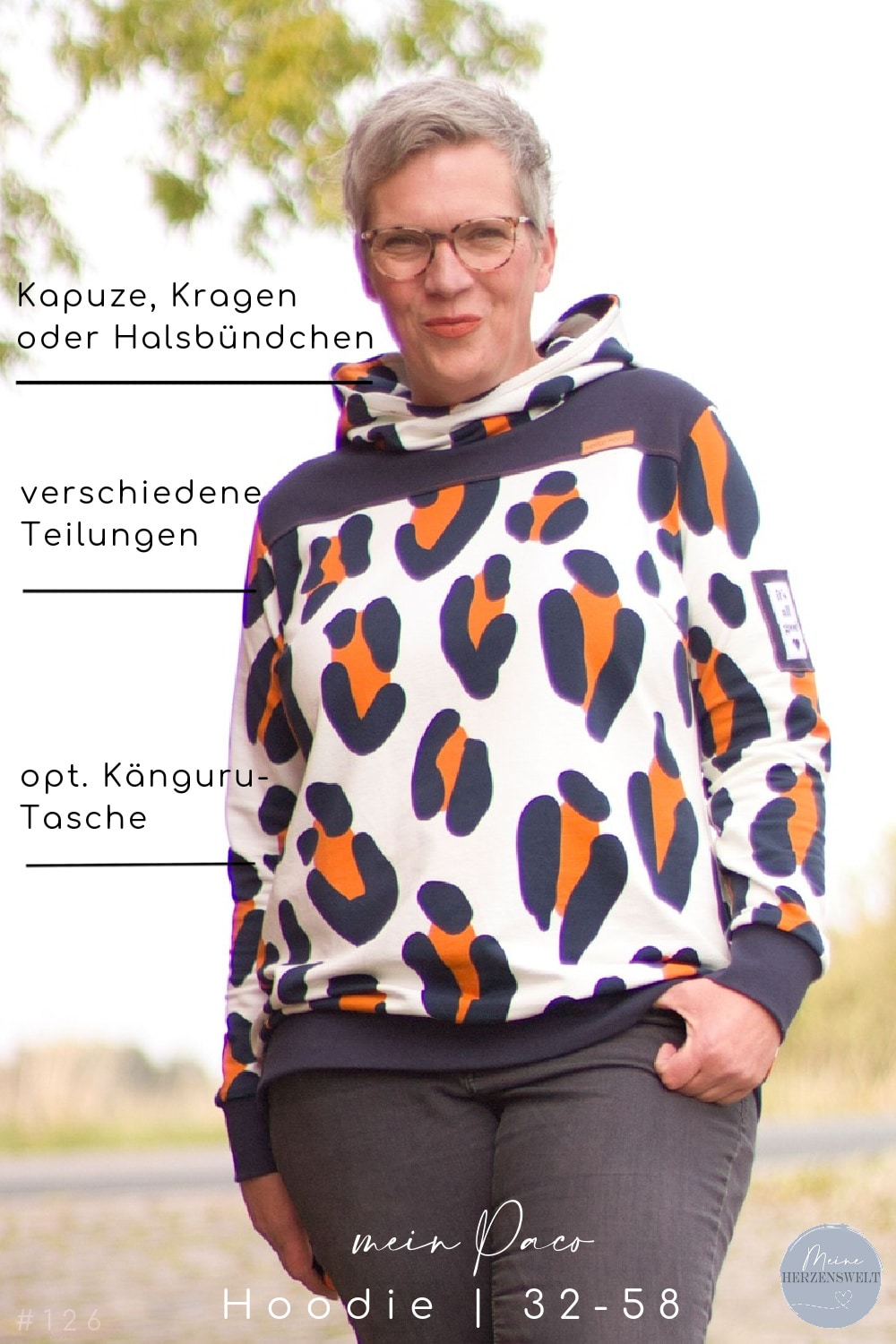 Paco ist ein vielfältiges Schnittmuster, aus dem du einen Hoodie/Pullover mit oder ohne Teilung im oberen Arm-, Brust- und Rückenbereich nähen kannst. Mit diesem Schnitt können Stoffreste verbraucht und Unistoffe kombiniert werden. Du kannst beim Abschluss des Halses zwischen Kapuze, Kragen oder einem Halsbündchen wählen. Zudem enthält das Schnittmuster eine Bauchtasche.