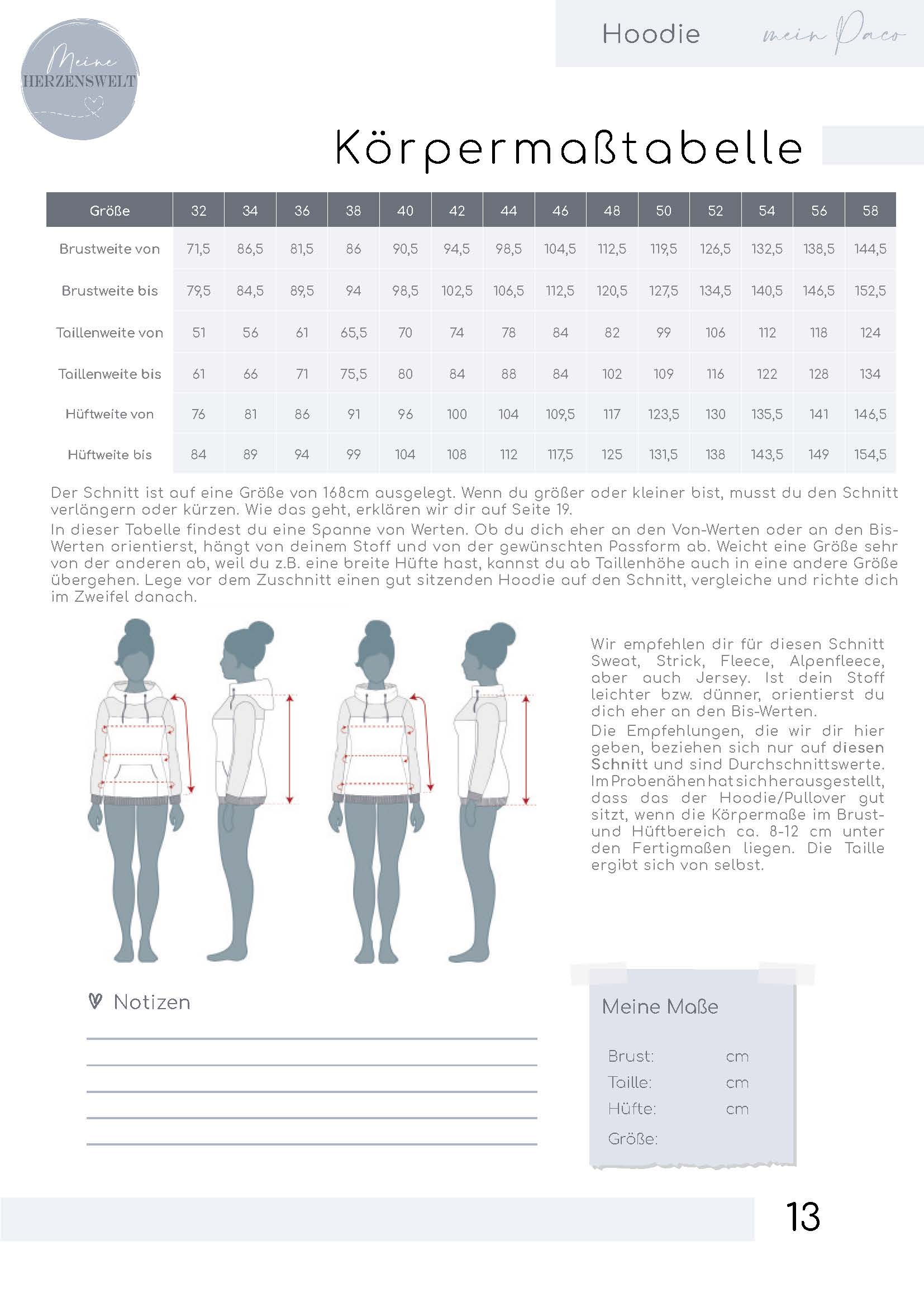 Der Schnitt dein Paco beinhaltet ein Schnittmuster in den Größen 32-58.