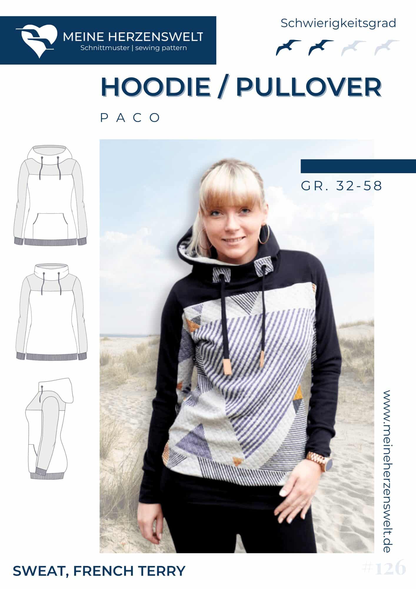 Stoffwahl: Für Paco eignen sich etwas dickere dehnbare Stoffe wie z.B. Sweat, French Terry und ähnliche Stoffe. Auch dünnere Stoffe wie z.B. Jersey sind möglich. Zusätzlich benötigst du Bündchenware, Kordeln, Ösen und evtl. Vlieseline zur Verstärkung.