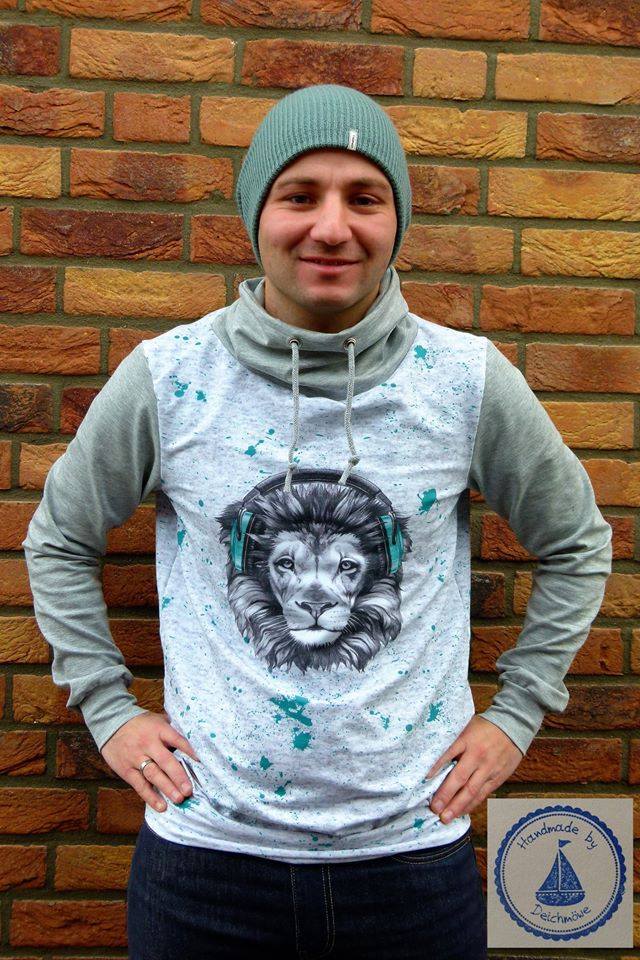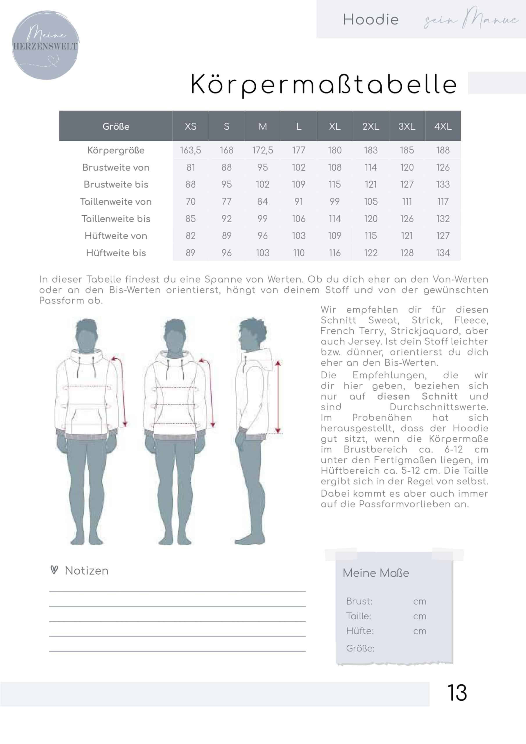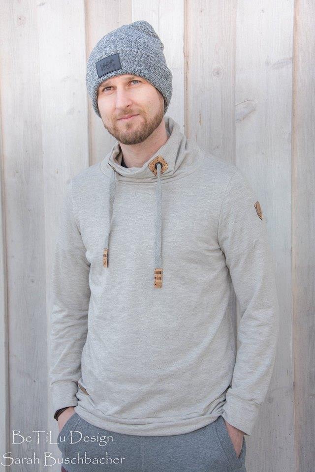 Mit unserem Schnittmuster Manuc bekommst du einen Schnitt für einen Hoodie bzw. einen Pullover mit Kapuze, Kragen oder Halsbündchen.