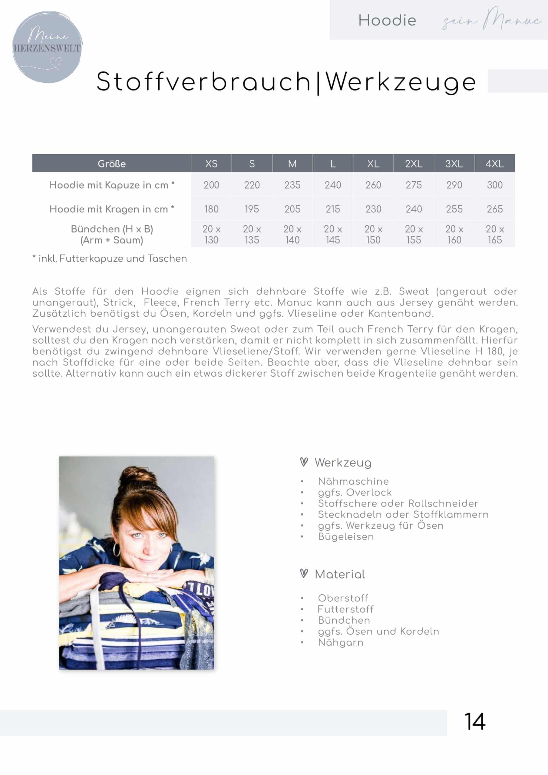 Stoffwahl: Für Manuc eignen sich etwas dickere dehnbare Stoffe wie z.B. Sweat, French Terry und ähnliche Stoffe. Auch dünnere Stoffe wie z.B. Jersey sind möglich. Zusätzlich benötigst du Bündchenware, Kordeln, Ösen und evtl. Vlieseline zur Verstärkung.