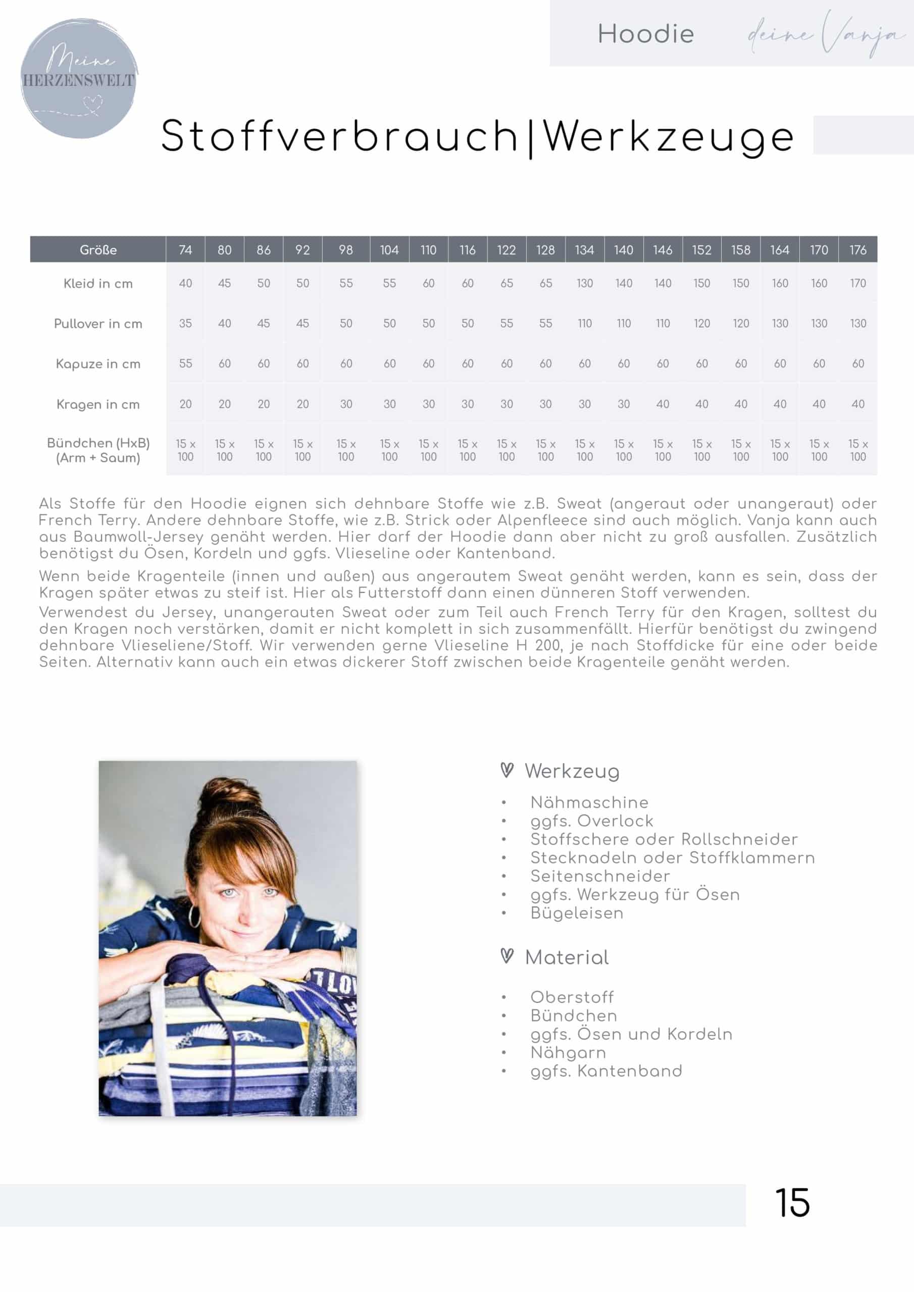 Für unseren Hoodie Vanja eignen sich etwas dickere, dehnbare Stoffe wie z.B. Sweat (angeraut oder unangeraut), French Terry, Strick, etc.. Auch dünnere Stoffe wie z.B. Jersey sind möglich.