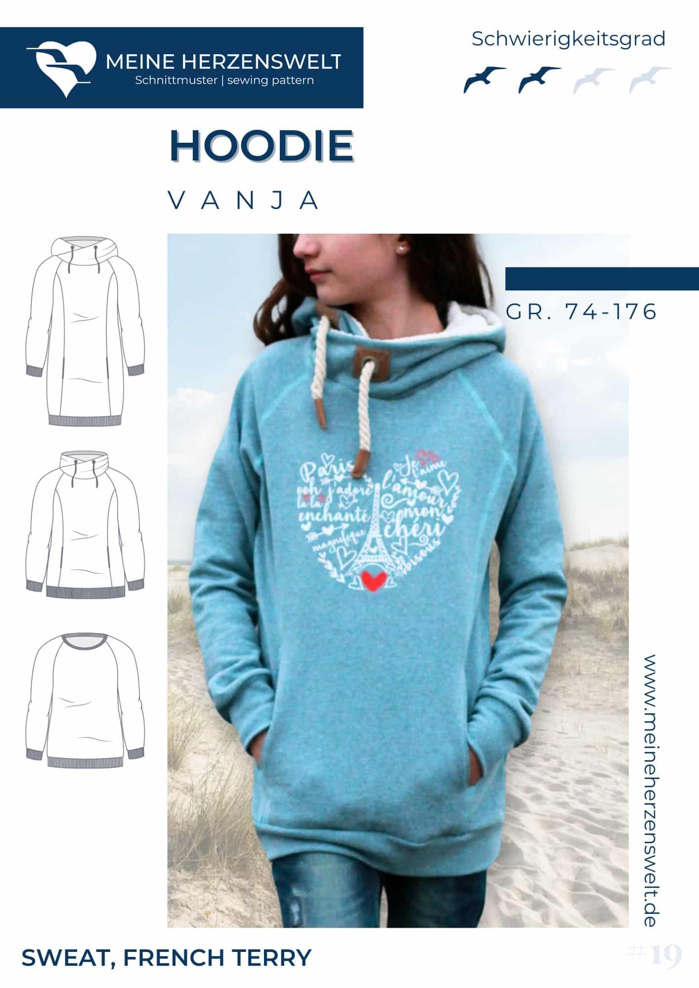 Vanja ist ein moderner Raglan – Hoodie mit mehreren Variationsmöglichkeiten: Pullover – oder Kleidlänge, Kapuze, XXL-Kragen oder schmales Bündchen, vordere Teilungsnähte oder aus einem Stück, versteckte Eingriffstaschen, tailliert oder gerade. Du hast sogar die Auswahl zwischen einer normal geschnittenen und einer Oversize-Kapuze.