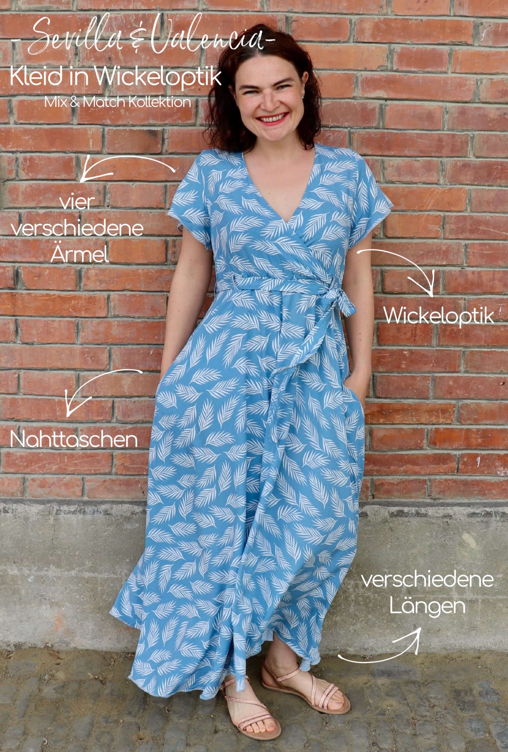 Unser Kleid Sevilla & Valencia ist eine Nähanleitung mit Schnittmuster für Kleid für leichte Webware für Damen. Das Oberteil des Kleides ist unsere Bluse Sevilla mit Wickeloptik. Die Bluse hat 4 verschiedene Ärmelvarianten: lang mit leichter Puffung, lang, kurzer Flügelärmel und ohne Ärmel. Der Rock des Kleides kann in drei verschiedenen Längen genäht werden: lang – knöchelbedeckend, mittel – kniebedeckend und kurz – etwa Kniehöhe. Außerdem sind im Schnittmuster auch Nahttaschen enthalten. Auf die Naht beider Teile wird ein Gummi genäht, so dass das Wickelkleid gut sitzt.