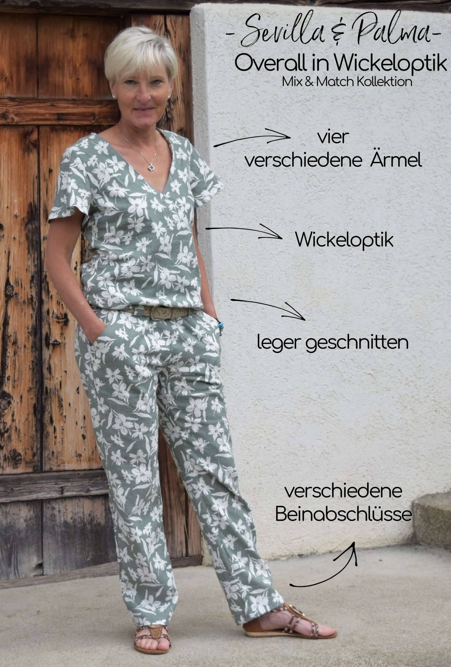 Unser Overall Sevilla & Palma ist eine Nähanleitung mit Schnittmuster für einen Overall bzw. Jumpsuit für leichte Webware für Damen. Das Oberteil des Overalls ist unsere Bluse Sevilla mit Wickeloptik. Diese ist am Bauch schön leger geschnitten. Die Bluse hat 4 verschiedene Ärmelvarianten: lang mit leichter Puffung, lang, kurzer Flügelärmel und ohne Ärmel. Die Hose des Overalls hat Eingrifftaschen, Gesäßtaschen und einen Fake-Hosenschlitz. Hier hast du die Wahl zwischen drei verschiedenen Beinabschlüssen (Saum, Gummizug und gesmokter Bund). Auf die Naht beider Teile wird ein Gummi genäht, so dass der Einteiler gut sitzt und die Bluse etwas über die Hose fällt, so ist der Bauch perfekt kaschiert und muss nicht eingezogen werden.