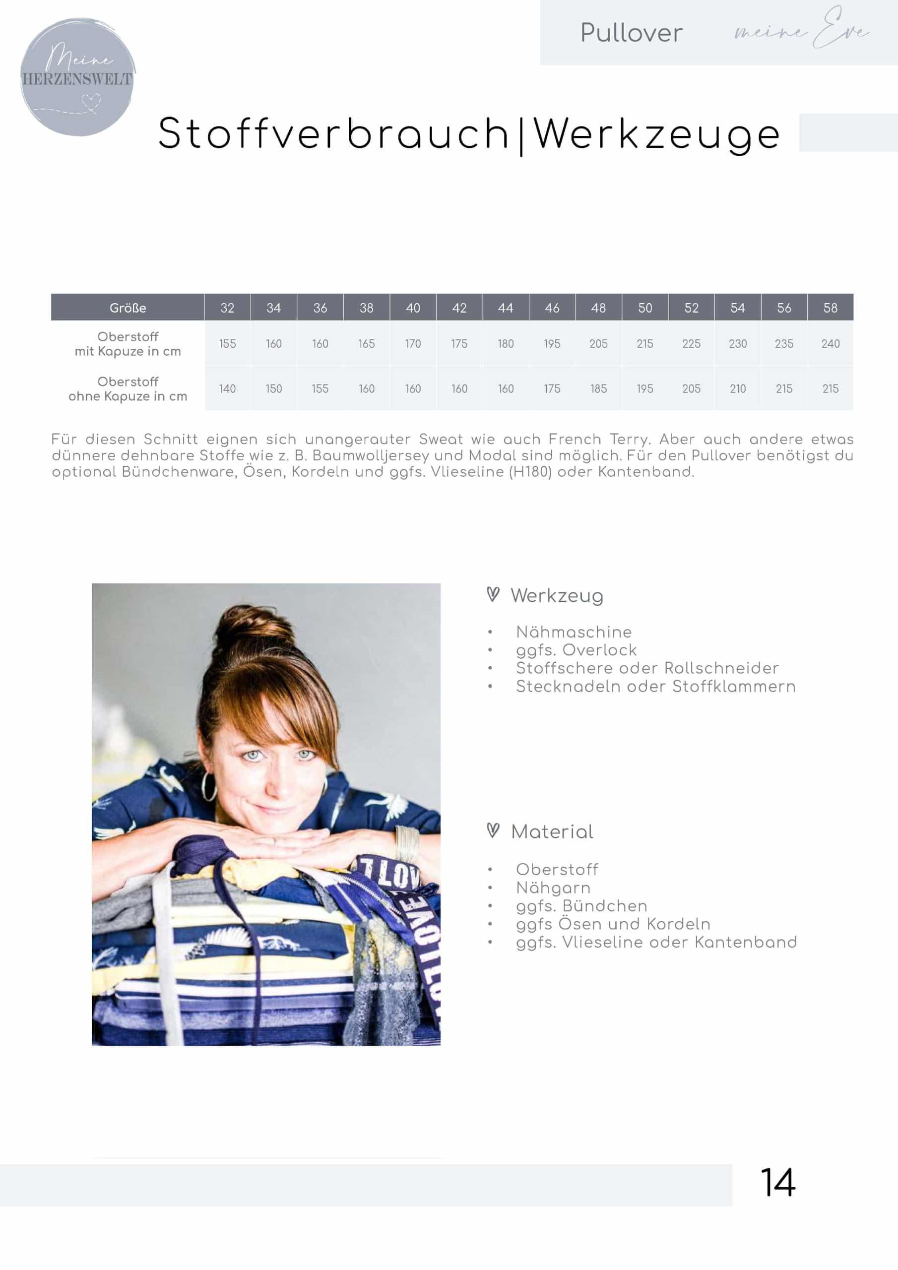 Der Schnitt „meine Eve“ beinhaltet ein Schnittmuster in den Größen 32-58. Ab 44 hat der Schnitt Brustabnäher.