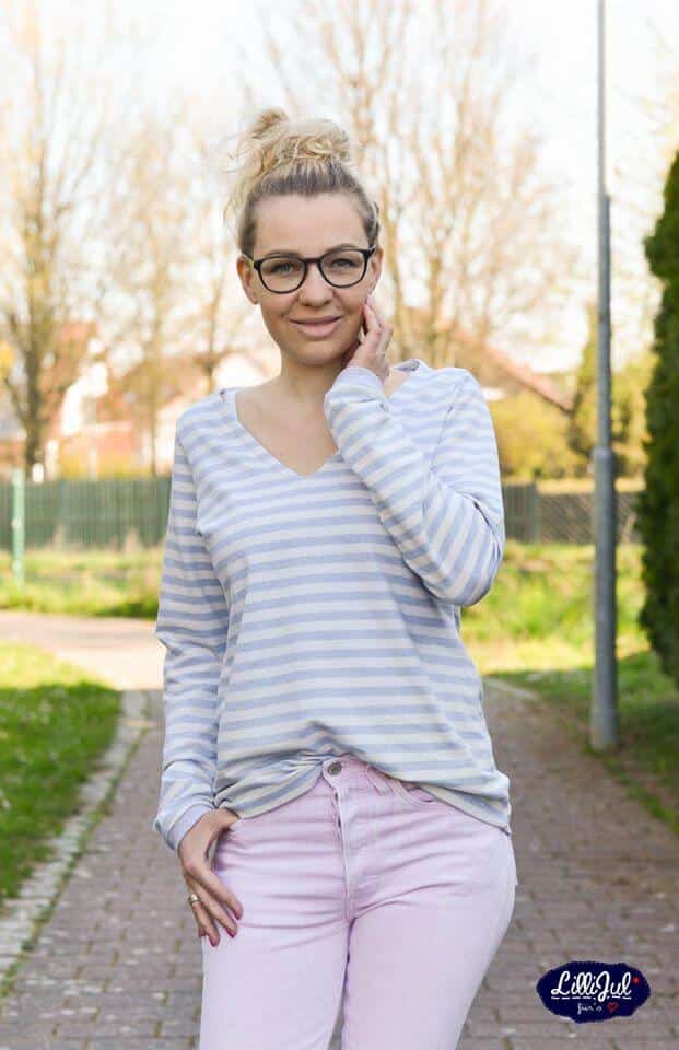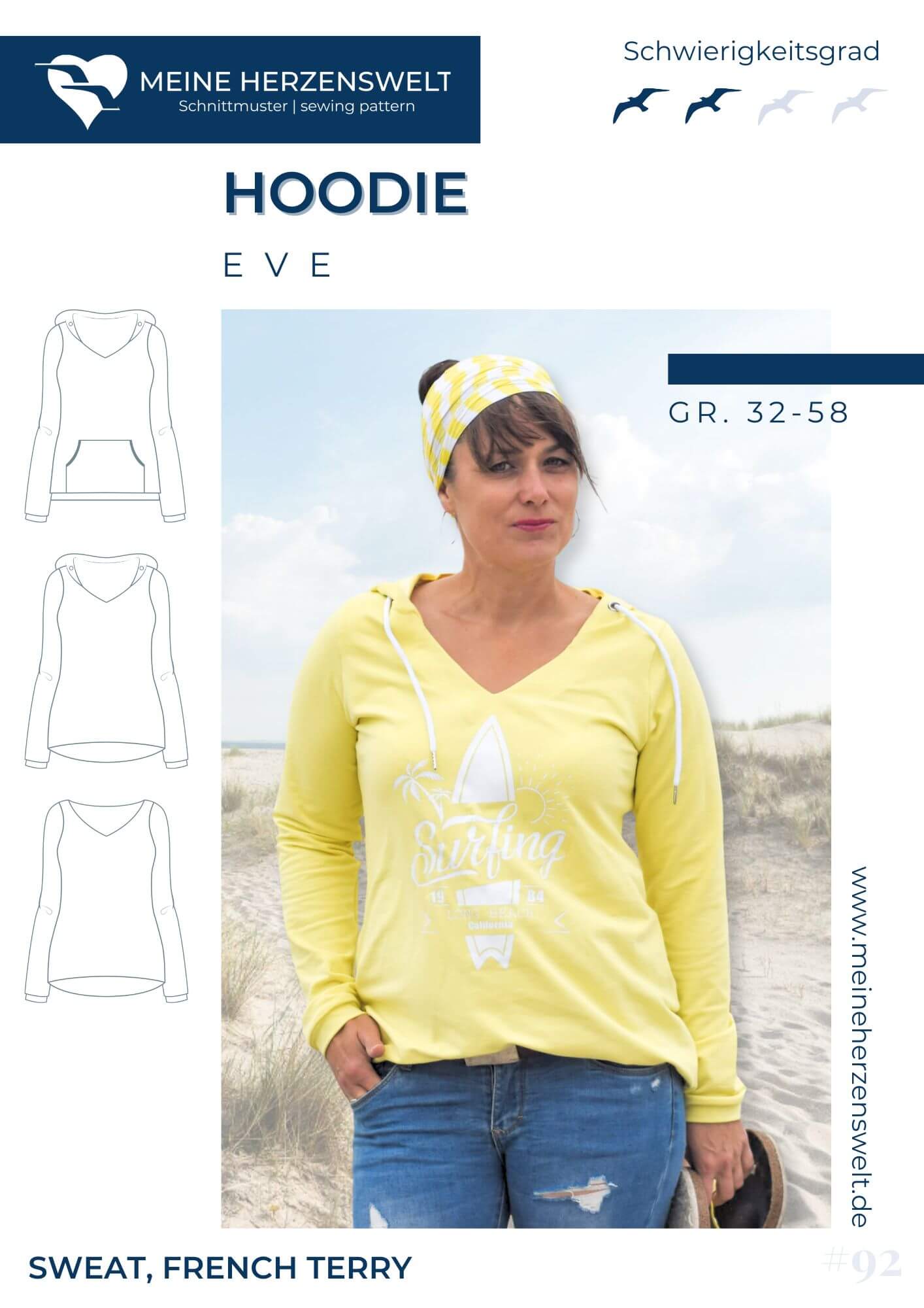 Eve ist ein Schnittmuster für einen legeren Pullover mit V-Ausschnitt. Mit diesem Schnittmuster kannst du schnell und einfach einen Pullover mit V-Ausschnitt und Beleg nähen oder aber einen Hoodie. Bei Eve stehen dir zwei Passformen zur Verfügung: die normale Passform, die locker sitzt oder eine Vokuhila-Variante (vorne kurz – hinten lang), die noch etwas lässiger fällt. Der Pullover ist schnell und einfach genäht und gut erklärt, so dass es auch für Anfänger geeignet ist. Optional gibt es noch eine Kängurutasche und einen ¾ Ärmel.