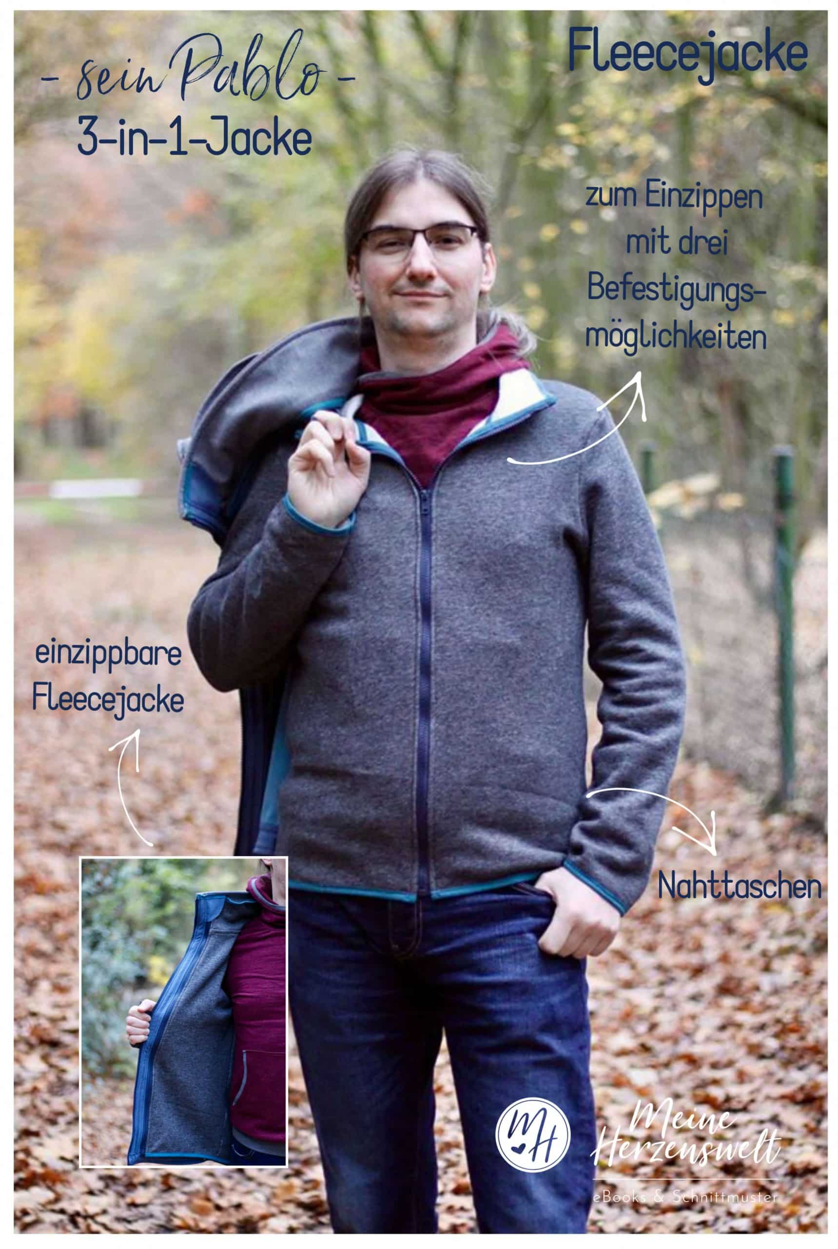 Pablo ist auf Softshell ausgelegt, die Fleecejacke auf Fleece. Dafür kann aber auch Sweat oder ähnlicher Stoff verwendet werden. Für die Außenjacke kann auch Walk verwendet werden.