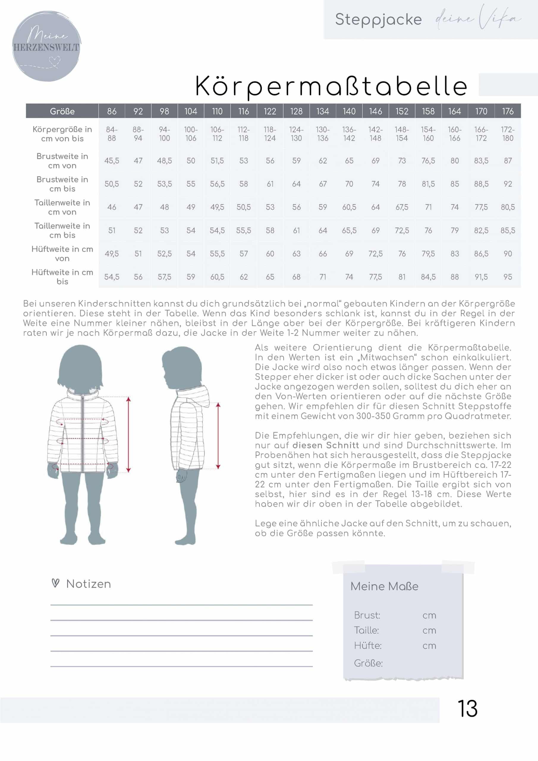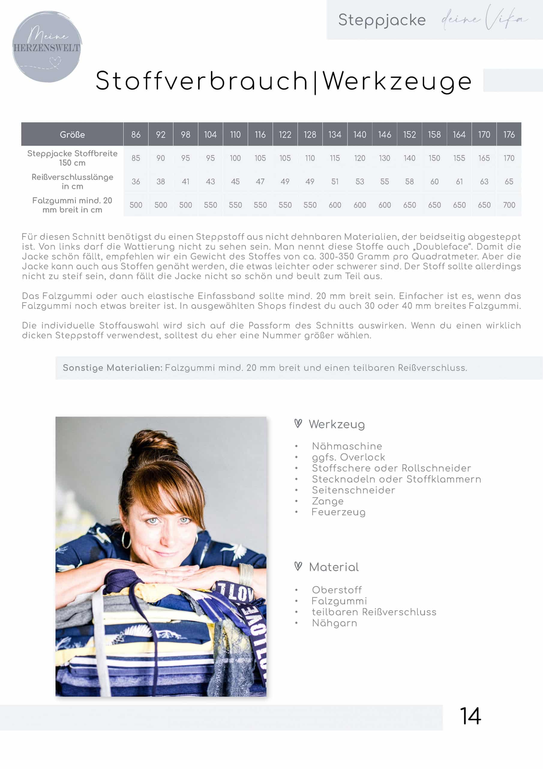 Dier Steppjacke „deine Vika“ beinhaltet ein Schnittmuster in den Größen 86-176. Für diesen Schnitt benötigst du einen Steppstoff aus nicht dehnbaren Materialien, der beidseitig abgesteppt ist. Von links darf die Wattierung nicht zu sehen sein. Man nennt diese Stoffe auch „Doubleface“. Damit die Jacke schön fällt, empfehlen wir ein Gewicht des Stoffes von ca. 300-350 Gramm pro Quadratmeter. Aber die Jacke kann auch aus Stoffen genäht werden, die etwas leichter oder schwerer sind.