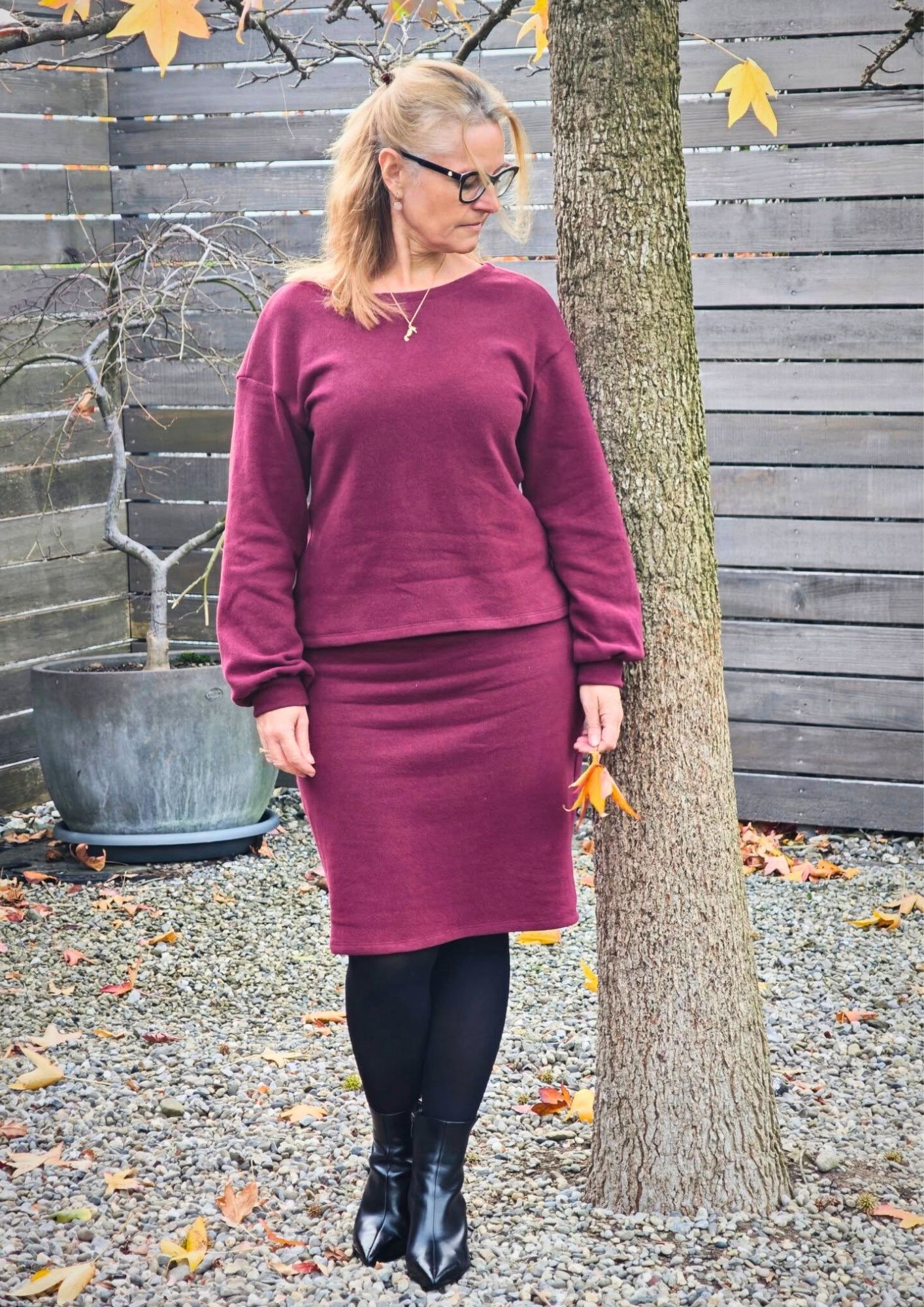 Stell dir vor, du gehst an einem kühlen Herbst- oder Wintertag durch die Stadt. Du trägst Boots, eine blickdichte Strumpfhose und darüber dein selbstgenähtes Strickoutfit, ein Look, den du dir ganz einfach als Strickoutfit nähen kannst: ein fließender Rock Lynn, der jede Bewegung mitnimmt, und ein weicher Pullover Visby, der warm hält, ohne aufzutragen.