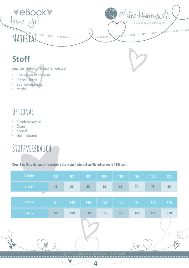 Jill ist auf leichte, dehnbare Stoffe ausgelegt. Am besten eignen sich unangerauter Sweat, French Terry oder Baumwolljersey. Dazu benötigst du je nach Vorlieben Bündchenware, Ösen, Kordeln und Gummiband.