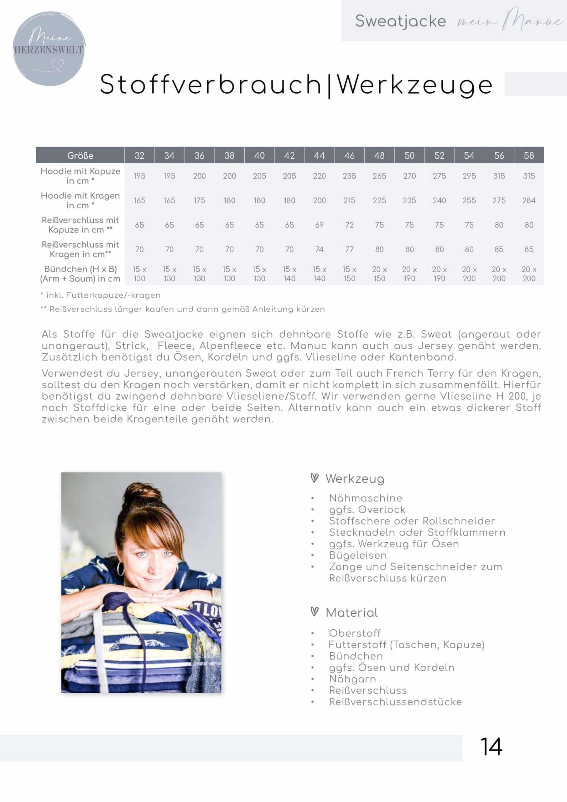 Stoffwahl: Für Manuc eignen sich etwas dickere dehnbare Stoffe wie z.B. Sweat, French Terry und ähnliche Stoffe. Auch dünnere Stoffe wie z.B. Jersey sind möglich. Zusätzlich benötigst du Bündchenware und einen Reißverschluss, Kordeln, Ösen und evtl. Vlieseline zur Verstärkung.