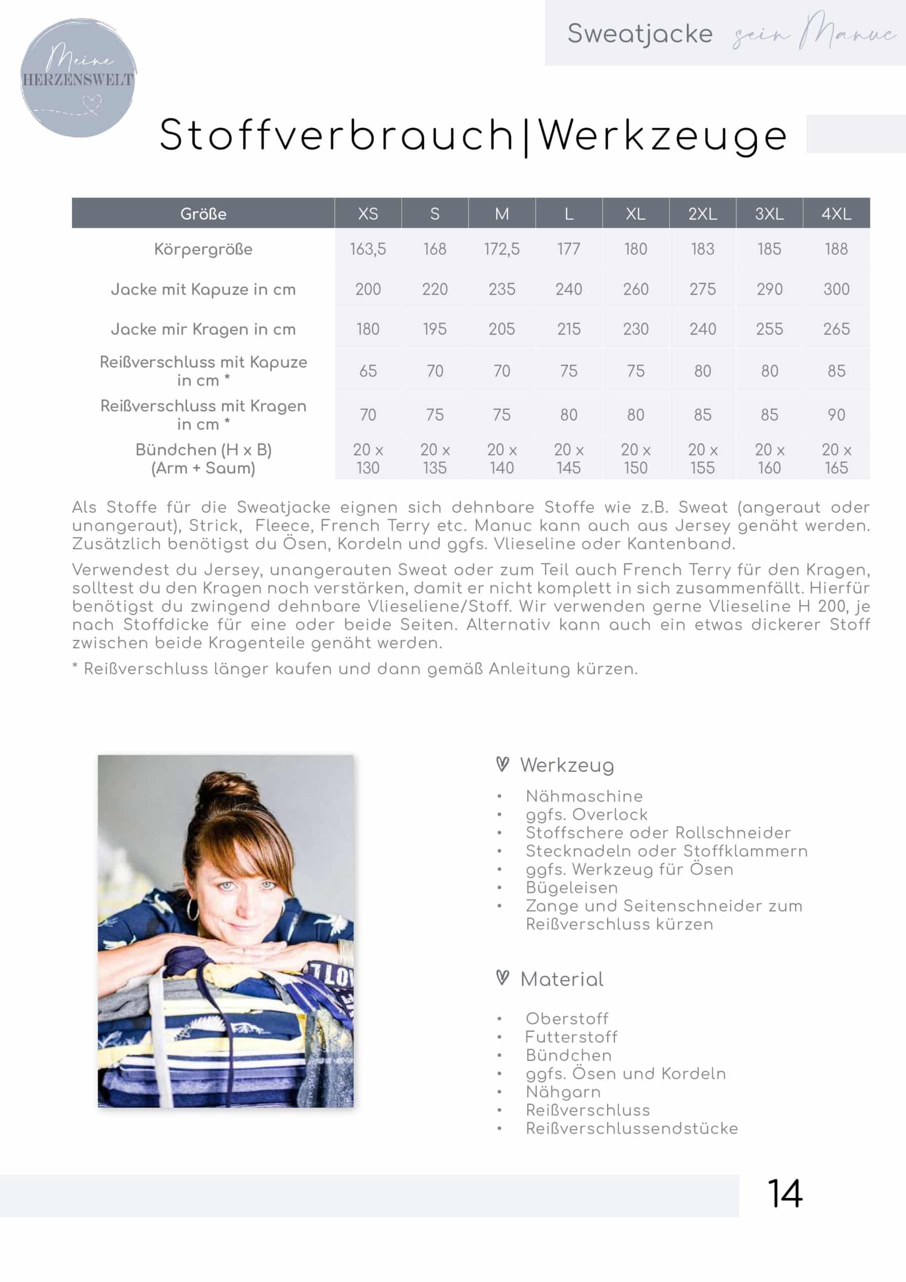 Stoffwahl: Für Manuc eignen sich etwas dickere dehnbare Stoffe wie z.B. Sweat, French Terry und ähnliche Stoffe. Auch dünnere Stoffe wie z.B. Jersey sind möglich. Zusätzlich benötigst du Bündchenware und einen Reißverschluss, Kordeln, Ösen und evtl. Vlieseline zur Verstärkung.